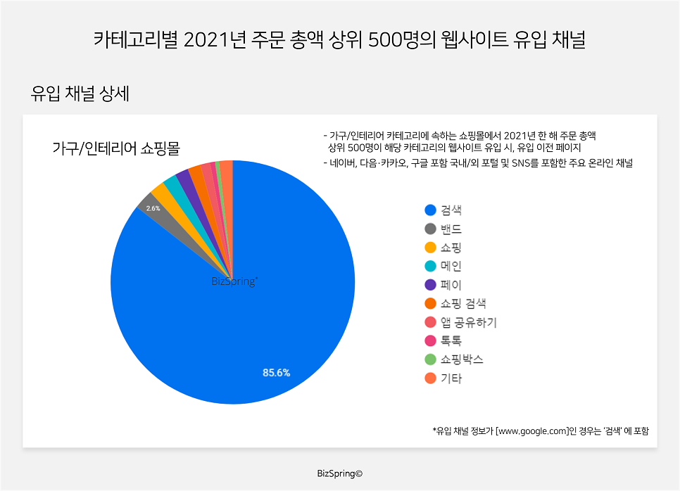 카테고리별 2021년 주문 총액 상위 500명의 웹사이트 유입 채널 : 주요 유입 채널
