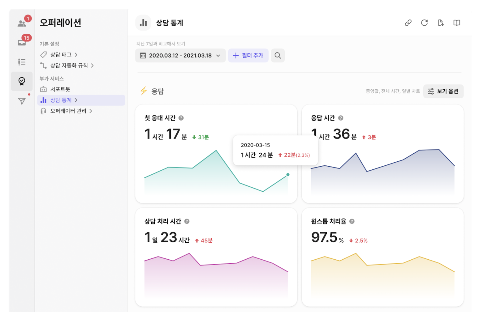채널톡의 추천 기능 중 하나가 바로 ‘상담 통계’ 기능인데요. ‘프리오더’시즌에는 CS 인입량도 평소와 달리 크게 늘어나거든요. 이를 정확하게 분석하기 위해선 상담 내용을 수치화하여 일 상담 응대 가능량이나 조직 운영 방식을 미리 정해두어야 합니다. 채널톡의 경우, 다양한 상담 통계를 제공하고 있어 단시간 내에 상담 인사이트를 빠르게 확인하고 적절한 상담 인원을 배치하는데 도움이 되었어요.