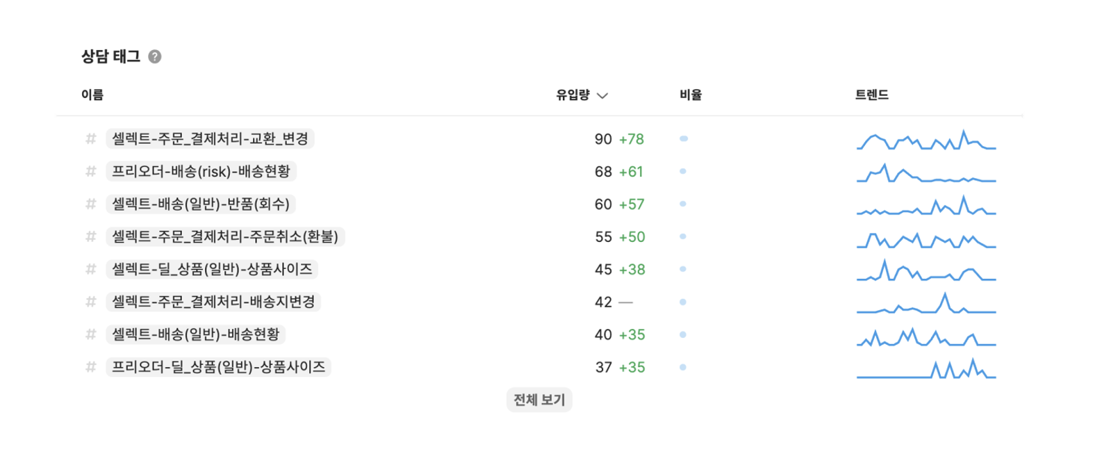 상담 데이터를 정리를 할 때 단순히 상담량 뿐만 아니라 어떤 유형의 고객 문의가 많이 들어왔는지를 상담 태그를 통해 파악하고 있어요.