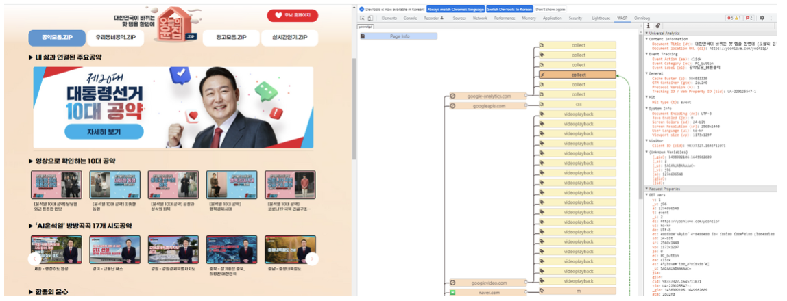 반면 UTM은 활용하지 않던, 윤석열 후보 캠프의 홍보 페이지는 신기하게도 이벤트 태깅은 또 꼼꼼하게 세팅이 되어 있었습니다. 다만 UTM을 활용하지 않아서 획득 관점의 분석이 불가능한 상황에서 이를 잘 활용할 수 있을지는 또다시 의문입니다.