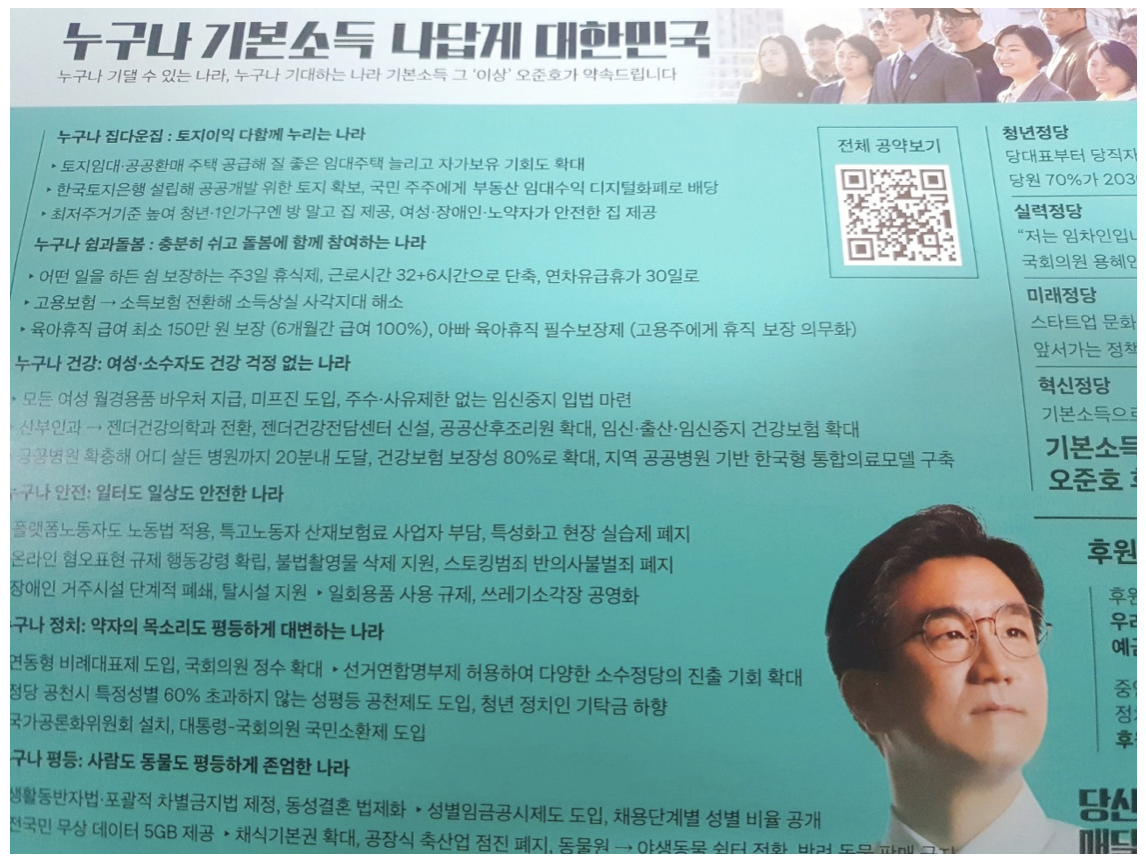 그렇다면 도대체 어디에 QR코드를 넣으면 효과적일까요? 저는 모든 유권자가 받아보는 종이 매체, 선거 공보물이 바로 떠올랐습니다. 선거 공보물은 법적으로 모두가 거주지에서 받아보게 됩니다. 더욱이 종이로 만들어지기 때문에, 비용도 꽤나 만만치 않은데요. 그래서 자본이 풍부한 후보 캠프의 공보물은 두툼한 반면, 군소 후보들은 심지어 1장이 오는 경우도 종종 있습니다.