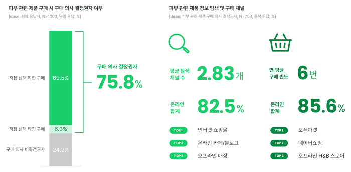남성의 피부 관련 제품 구매, 주로 온라인으로 연평균 6회