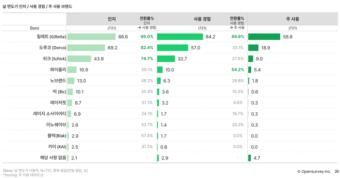 이번에는 가장 이용률이 높은 날 면도기 카테고리만 집중적으로 살펴봅니다. 여러 날 면도기 브랜드의 인지, 사용 경험, 주 사용률을 조사해서 브랜드 퍼널 분석을 진행한 겁니다. 역시나 날 면도기 시장 부동의 1위인 질레트의 브랜드 성과가 가장 좋은 것으로 나타납니다. 인지도, 사용 경험, 주 사용율 모두 압도적 1위로 나타났기 때문입니다(각 88.6%, 84.2%, 58.8%). 인지→사용 경험 전환율, 사용 경험→주 사용 전환율 또한 가장 높습니다(각 95.0%, 69.8%).