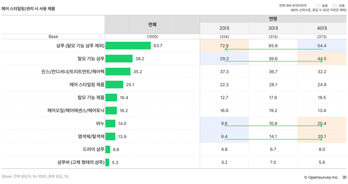 마지막으로 헤어 스타일링 및 탈모 관리 시장을 살펴봅니다. 최근 바버샵 등 남성 전용 헤어샵이 점차 늘고 있고, 남성 뷰티 유튜버 등 콘텐츠도 다양해지면서 헤어 스타일링에 대한 관심이 늘고 있다는 기사를 종종 찾아볼 수 있습니다. 그런데 남성들은 아직까지는 헤어 스타일링 제품으로 샴푸·탈모 기능 샴푸·린스/컨디셔너 등을 주로 사용합니다(각 63.7%, 38.2%, 35.2%). 왁스·포마드 등 헤어 스타일링 제품군 전체로 묶어서 사용률은 단 25.1%에 불과합니다.