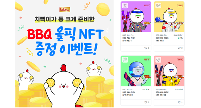 BBQ 앱 회원이라면 설문 조사만 제출하면 참여할 수 있었던 간단한 이벤트 참여 방법과 동계 올림픽 선수단을 응원한다는 메시지로 시의성까지 좋았던 NFT 증정 이벤트예요. BBQ의 마스코트 ‘치빡이’ 이미지를 활용한 이 올픽 NFT 홀더 대상으로 추후 특별 이벤트&할인 혜택까지 제공된다는 사실이 알려지며 참여 열기는 더 뜨거워졌는데요, 보도자료에 따르면 시작 이후 일 1,000명 이상의 참여자가 몰렸다고! 올픽 NFT를 받기 위해 BBQ 앱 회원가입이 필수였던 만큼 회원 확보에 유의미한 영향을 미쳤으리라 조심스럽게(하지만 단호하게) 예상해 봅니다.