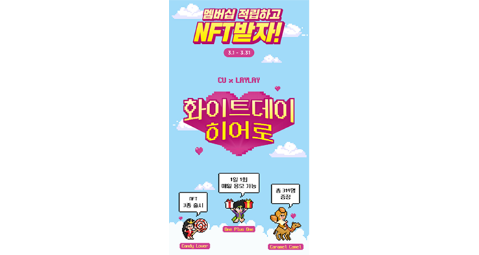 이벤트 기간이 절반밖에 진행되지 않았음에도 불구하고, 경쟁률 73 대 1을 자랑하며 일 평균 1,500명 이상이 참여한 NFT 이벤트입니다. NFT 전문 작가 레이레이와 협업하여 특별한 능력을 가진 히어로 3종을 제작했어요. 실제로 제품을 구매하고 → 포인트를 적립하면 →멤버십 앱 포켓 CU에 생성되는 응모권으로 원하는 작품에 응모할 수 있다고 해요. 이벤트 참여 방법 (‘제품 구매’ 와 ‘포켓 CU 앱 설치 및 회원가입’)과 3월 한 달 동안 1일 1회 매일 응모가 가능했기 때문일까요? 행사 이후 앱 가입자 수가 전월 동기 대비 무려 21.6%나 늘었다고!