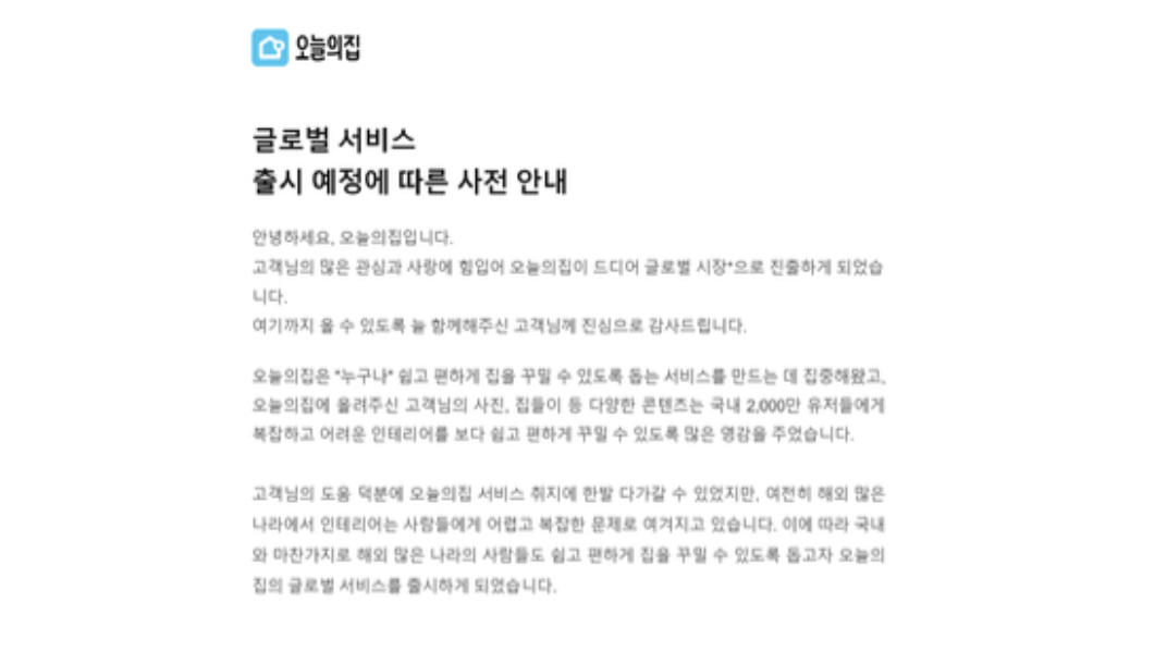오늘의집은 회원들에게 보낸 '글로벌 서비스 출시 예정에 따른 사전 안내'라는 제목의 메일을 통해 해외 시장 진출을 공식화하였는데요. 특히 우선 진출 고려 지역으로 미국과 싱가포르를 콕 집었습니다. 괜히 미국과 싱가포르 투자사들과 접촉한 것이 아니었던 거죠. 아마 투자금은 물론이고, 현지 시장 공략에도 여러 지원을 받지 않을까 싶습니다.