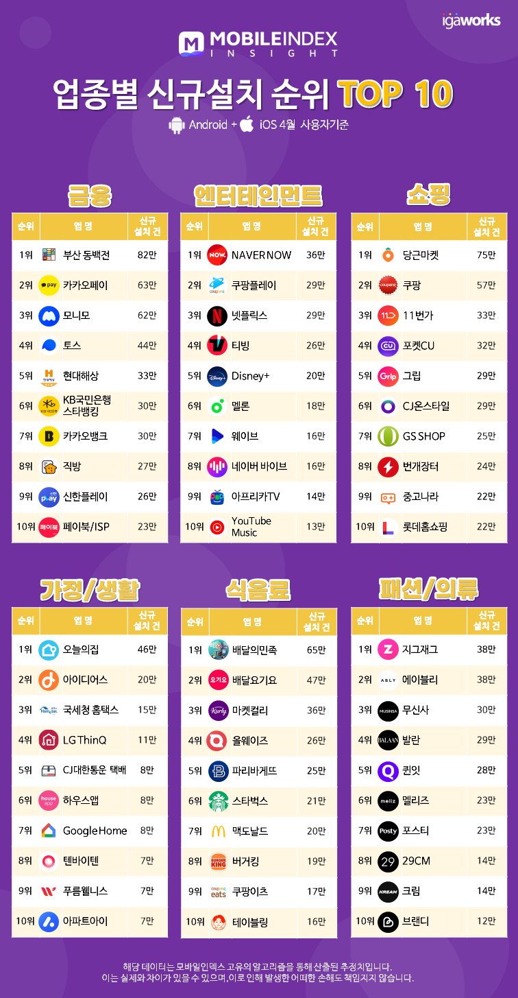 엔터테인먼트에서는 네이버가 새롭게 선보이는 라이브 방송 앱 'NAVER NOW'가, 쇼핑에서는 중고거래 플랫폼 '당근마켓', 가정/생활 업종에서는 홈인테리어 앱 '오늘의집', 식음료에서는 '배달의민족', 패션/의류에서는 '지그재그'가 각각 1위를 차지했습니다.