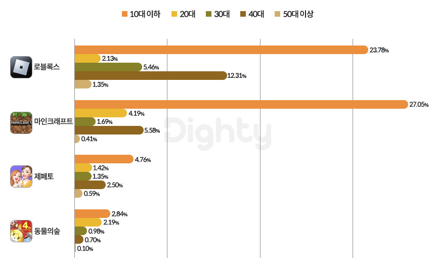 '메타버스' 하면 어떤 단어가 연관되시나요? 'MZ'가 떠오르시나요? 그러나 성인인 M세대와 10대인 Z세대를 같이 묶긴 어려울 것 같습니다. Dighty Data Market의 🔗2021 국내&글로벌 메타버스 앱 분석 리포트에 따르면 메타버스 플랫폼을 사용하는 연령은 10대가 압도적임을 확인할 수 있습니다. 🔗대학내일 연구소의 리포트를 보더라도 세대에서 메타버스를 인지하고 직접 이용하게 되는 비율, 즉 이용 전환율에서 밀레니얼 세대와 큰 차이를 보입니다.