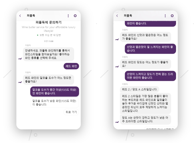 와인 구독 서비스 퍼플독은 챗봇을 통해 고객들의 와인 취향을 알려주는 와인매치 서비스를 제공합니다. 간단한 문답을 통해 어떤 타입의 와인을 좋아하는지 알려주고, 자신이 좋아하는 타입의 와인을 구독할 수 있도록 이끄는 거죠. 브랜드 입장에서는 챗봇의 와인매치 서비스를 통해 고객의 취향을 파악한 데이터를 얻을 수 있게 되고, 이에 따라 추천 제품 등 다양한 서비스로 응대할 수 있게 됩니다.