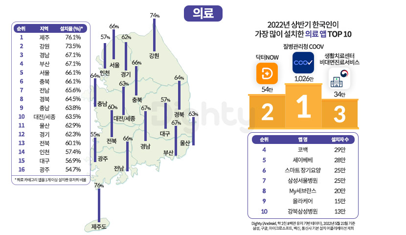 다음으로 의료 카테고리에 관심이 높은 지역을 알아봤는데요. 의료 카테고리 앱을 1개 이상 설치한 유저의 비율이 높은 지역은 제주(76.1%), 강원(73.5%), 경남(67.1%) 순으로 나타났고 가장 설치율이 높은 의료 카테고리의 3개 앱은 질병관리청 COOV(1,026만), 닥터NOW(54만), 생활치료센터 비대면진료서비스(34만)이었습니다.