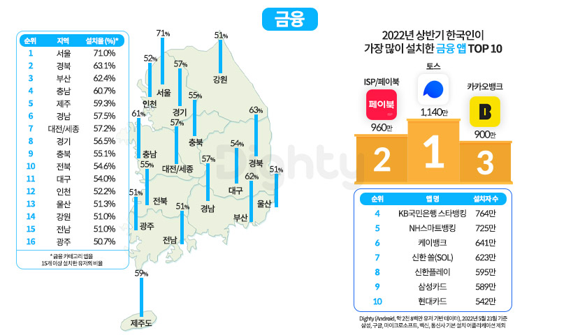 다음으로 금융 카테고리에 관심이 높은 지역을 알아봤는데요. 금융 카테고리 앱을 15개 이상 설치한 유저의 비율이 높은 지역은 서울(71.0%), 경북(63.1%), 부산(62.4%) 순으로 나타났고 가장 설치율이 높은 의료 카테고리의 3개 앱은 토스(1,140만), ISP/페이북(960만), 카카오뱅크(900만)이었습니다.