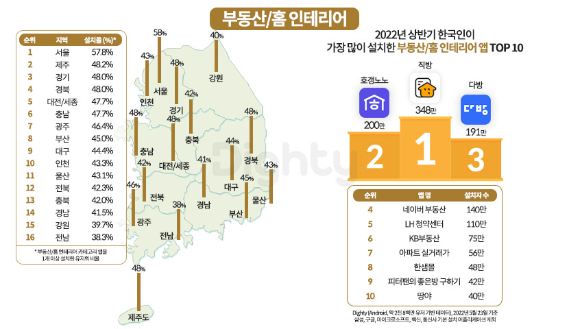 다음으로 부동산/홈 인테리어 카테고리에 관심이 높은 지역을 알아봤는데요. 부동산/홈 인테리어 카테고리 앱을 1개 이상 설치한 유저의 비율이 높은 지역은 서울(57.8%), 제주(48.2%), 경기(48.0%) 순으로 나타났고 가장 설치율이 높은 의료 카테고리의 3개 앱은 직방(348만), 호갱노노(200만), 다방(191만)이었습니다.