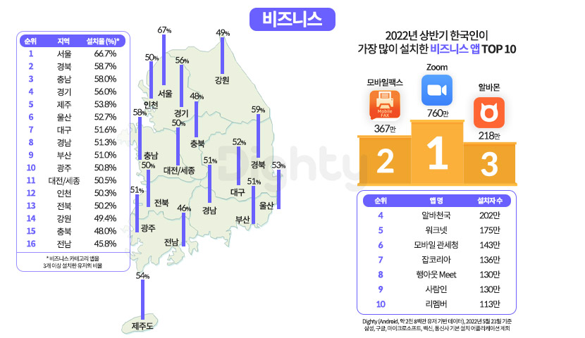 다음으로 비즈니스 카테고리에 관심이 높은 지역을 알아봤는데요. 비즈니스 카테고리 앱을 3개 이상 설치한 유저의 비율이 높은 지역은 서울(66.7%), 경북(58.7%), 충남(58.0%) 순으로 나타났고 가장 설치율이 높은 비즈니스 카테고리의 3개 앱은 Zoom(760만), 모바일팩스(367만), 알바몬(218만)이었습니다.