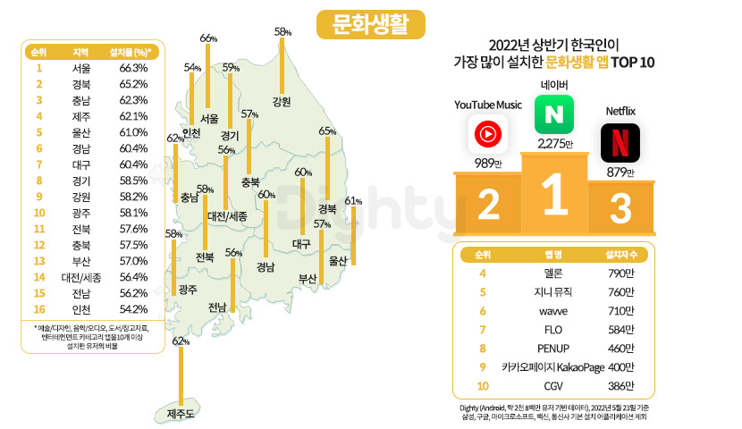다음으로 문화생활 카테고리에 관심이 높은 지역을 알아봤는데요. 문화 관련 카테고리 앱을 10개 이상 설치한 유저의 비율이 높은 지역은 서울(66.3%), 경북(65.2%), 충남(62.3%) 순으로 나타났고 가장 설치율이 높은 문화 카테고리의 3개 앱은 네이버(2,275만), 유튜브 뮤직(989만), 넷플릭스(879만)이었습니다.