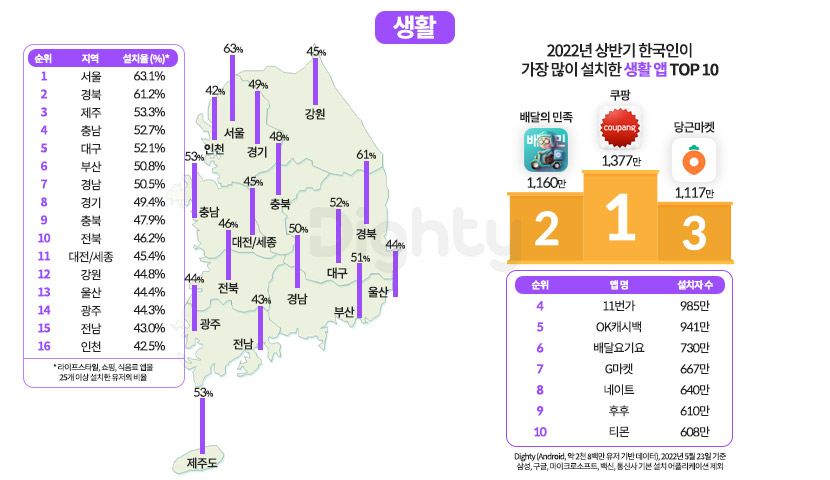 다음으로 생활 카테고리에 관심이 높은 지역을 알아봤는데요. 생활 관련 카테고리 앱을 25개 이상 설치한 유저의 비율이 높은 지역은 서울(63.1%), 경북(61.2%), 제주(53.3%) 순으로 나타났고 가장 설치율이 높은 문화 카테고리의 3개 앱은 쿠팡(1,377만), 배달의 민족(1,160만), 당근마켓(1,117만)이었습니다.