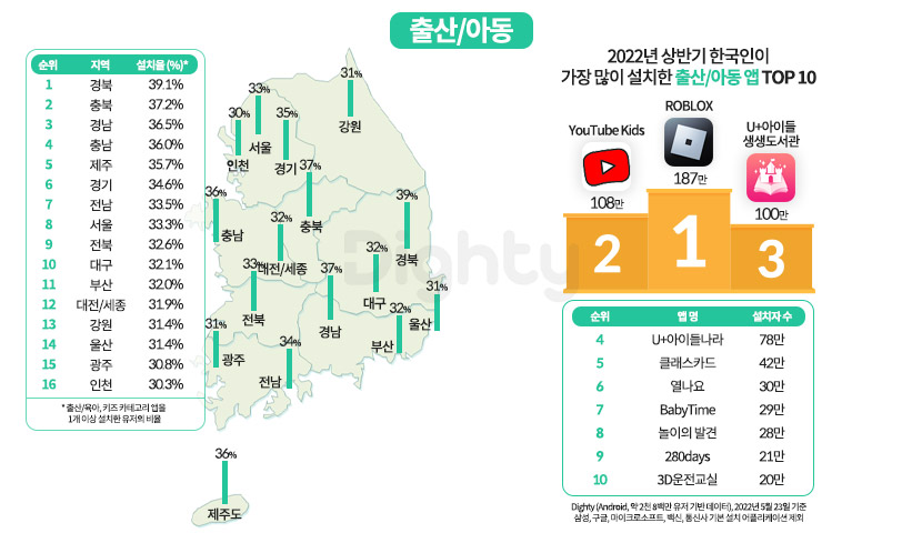 마지막으로 출산/아동 카테고리에 관심이 높은 지역을 알아봤는데요. 출산/육아, 키즈 관련 카테고리 앱을 1개 이상 설치한 유저의 비율이 높은 지역은 경북(39.1%), 충북(37.2%), 경남(37.2%) 순으로 나타났고 가장 설치율이 높은 출산/아동 카테고리의 3개 앱은 로블록스(187만), 유튜브 키즈(108만), U+아이들 생생도서관(100만)이었습니다.