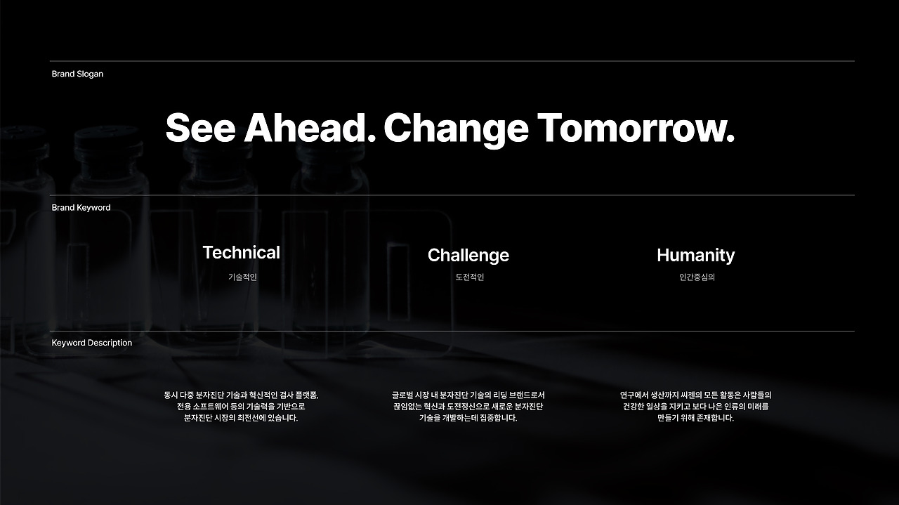 이 과정에서 유지할 것과 바꿔야 할 것이 무엇인지 정확한 기준으로 나누고 정립하는 절차가 필요했다. 씨젠은 브랜드 비전과 미션이 명확했지만, 핵심 가치를 전달하는 메시지가 확실하지 않았다. 이를 보완하기 위해 씨젠이 어떤 조직인지에 대한 명확한 정의부터 향후 그려 나갈 미래상에 이르기까지 폭넓은 질문이 담긴 사전 설문과 데스크 리서치를 진행했다. 모아진 답변을 토대로 브랜드 아이덴티티 근원이 되는 메시지를 한 단어로 정리한 결과, 도출한 핵심 가치는 다음과 같다.
