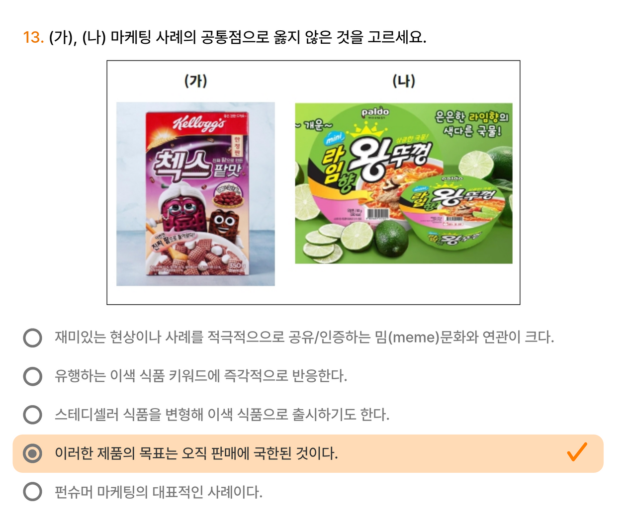 ④요즘 MZ세대 고객은 제품에서 ‘재미’를 찾고 있는데 이런 고객들을 ‘펀슈머(fun+consumer)’라고 부른다. 농심 켈로그가 출시한 ‘첵스 팥맛’, 팔도가 선보인 ‘라임 왕뚜껑 라면’은 펀슈머를 겨냥한 제품의 일종이다. 이런 제품의 목표는 ‘판매’에만 국한된 것이 아니라 시장의 변화 속에서 새로운 이미지를 만들기 위한 ‘마케팅 전략’에 가깝다.