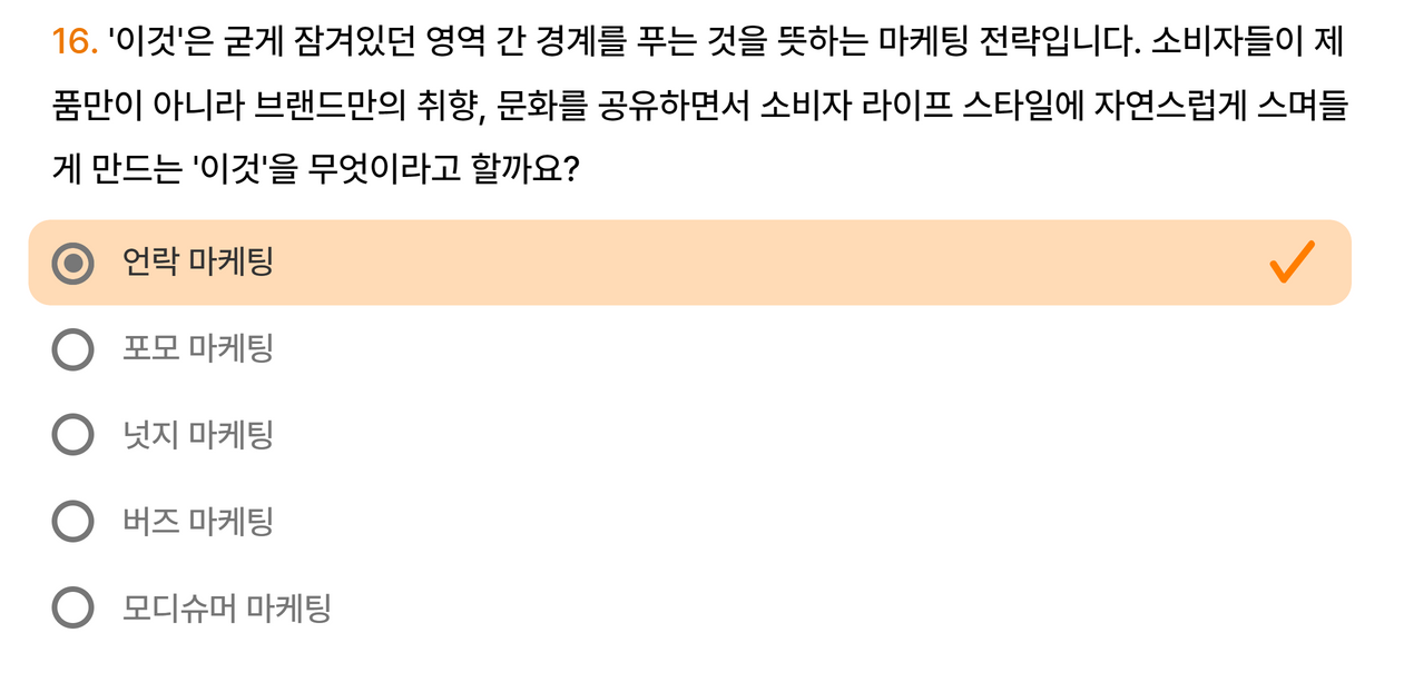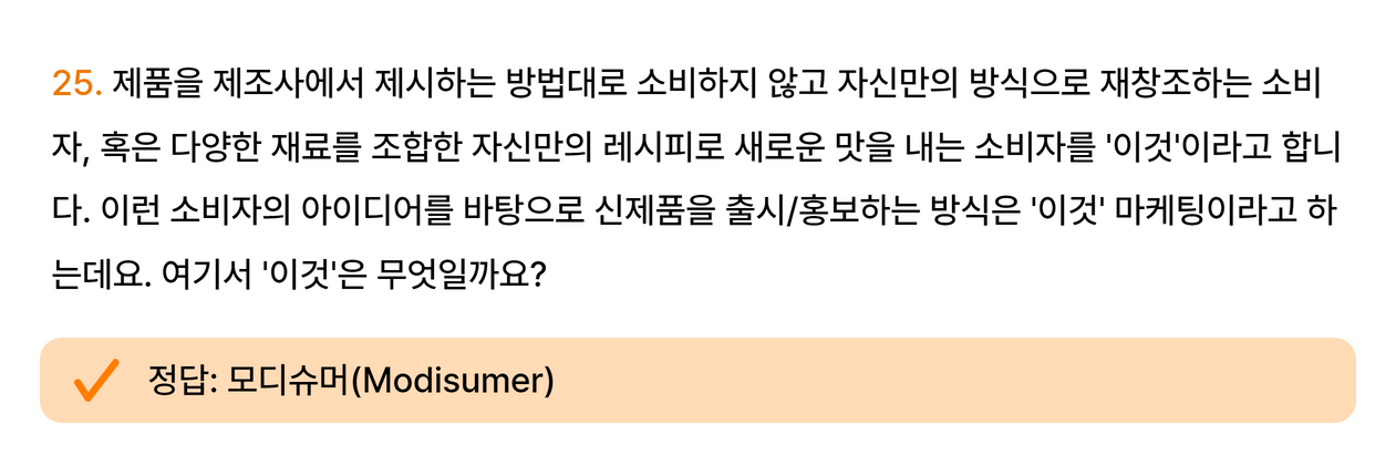 ⑤모디슈머 마케팅: 모디슈머는 제조업체에서 제시하는 방식이 아닌 사용자가 개발한 방식으로 제품을 활용하는 소비자를 뜻한다. 이런 모디슈머의 아이디어를 바탕으로 신제품을 출시하거나 홍보하는 방식을 모디슈머 마케팅이라고 한다.