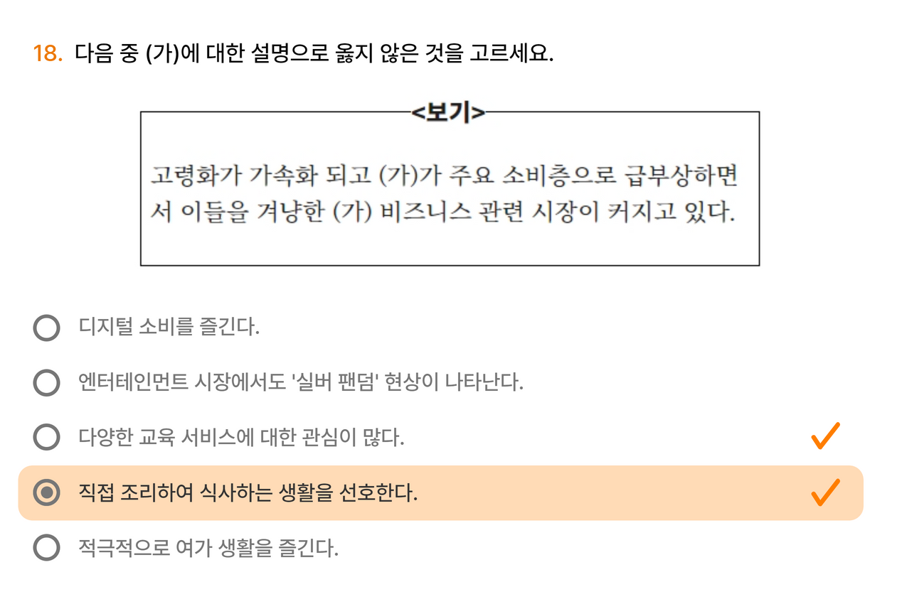 ④혼자 살거나 직접 음식을 만들지 못하는 시니어를 위한 케어푸드가 급부상하고 있는 것으로 보아 시니어가 직접 조리하여 식사하는 생활을 선호한다고 보기는 어렵다.