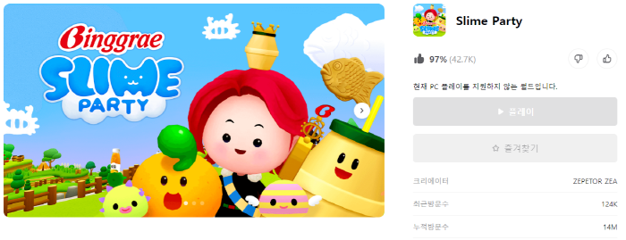 이런 빙그레 세계관은 사실 소위 말하는 Z세대가 특히 좋아할 법합니다. 그래서 빙그레는 이들의 마음을 다방면으로 사로잡고자 메타버스 플랫폼에도 진출했습니다. 바로 제페토에 슬라임 파티를 열어서 말이죠. 제페토 포맷에 맞는 캐릭터 디자인 변화와 간편한 조작법의 이점 때문일까요? 이 맵의 누적 방문수는 무려 1,400만이었습니다.