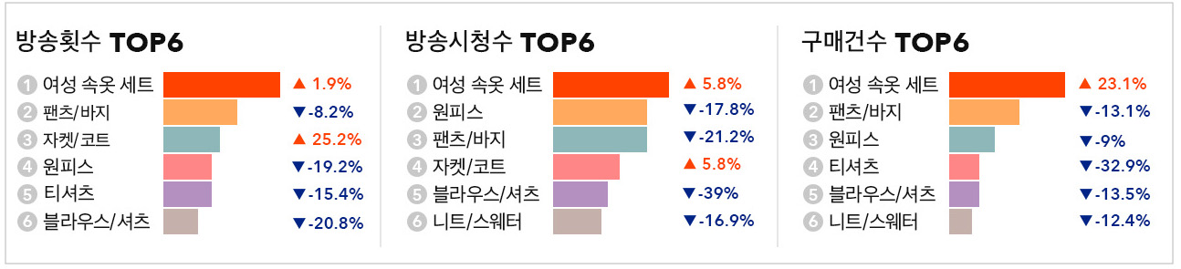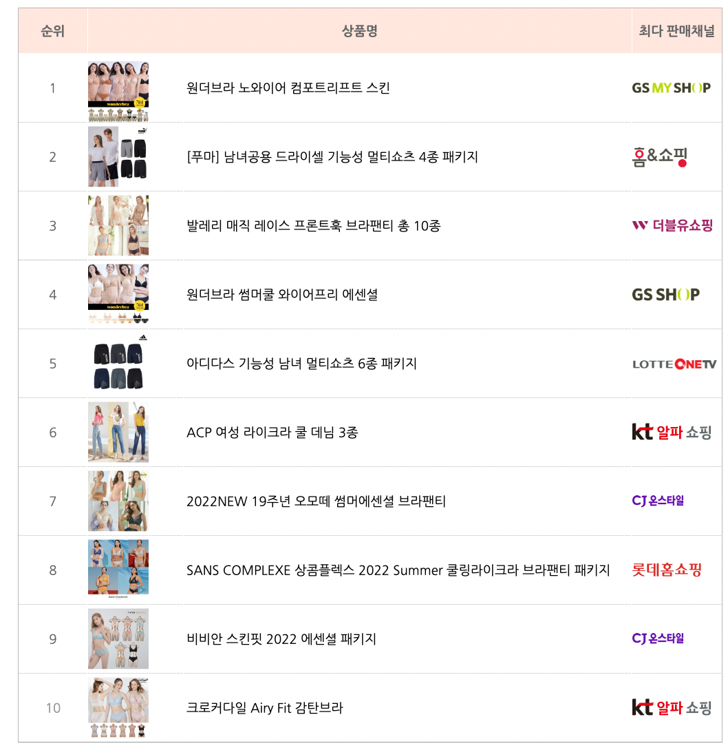지난 리포트 이어 7월 모바일 홈쇼핑 트렌드에서도 여성 속옷 세트가 모두 1위를 차지했습니다. 6월에도 이미 5월 대비 방송횟수가 8.3%(+), 방송시청수가 33.3%(+), 구매건수가 23.1%(+) 올라 유일하게 수치가 오른 의류 카테고리였는데요. 이번 리포트에서도 방송횟수가 1.9%(+), 방송시청수가 5.8%(+), 구매건수가 23.1%(+) 상승했습니다.