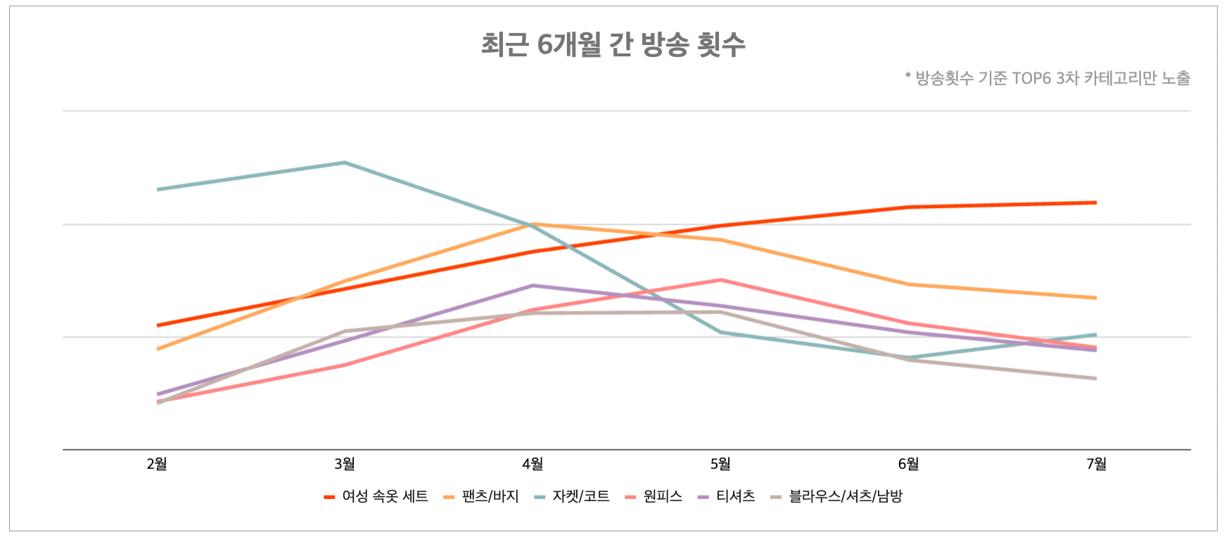 팬츠/바지의 경우 수치는 지난달 대비 하락해 방송시청수 순위도 함께 떨어졌습니다. 반면 다가올 가을을 대비한 자켓/코트 상품의 수치가 올랐습니다. 지난달에는 모든 수치가 떨어졌지만 7월에는 방송횟수가 25.2%(+), 방송시청수가 5.8%(+) 올라 점차 홈쇼핑사에서 가을을 준비하고 있는 모습을 보였습니다.