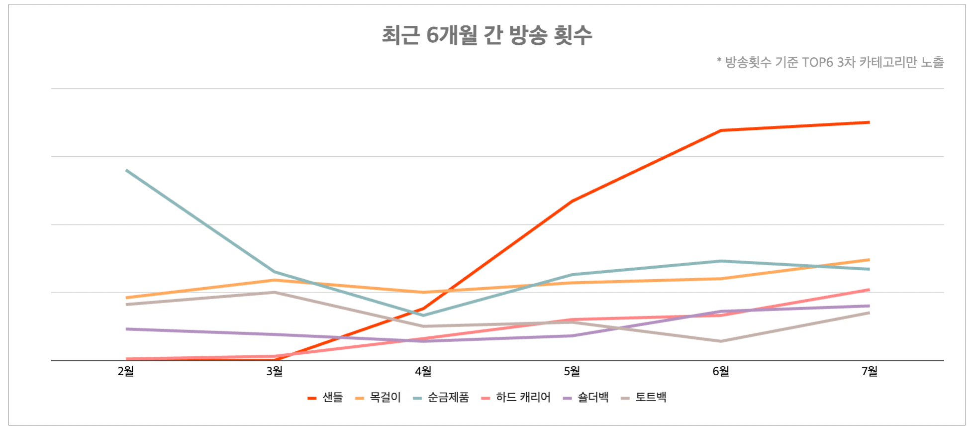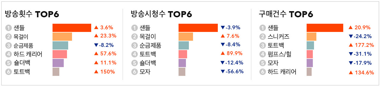 지난 6월에 이어 이번 7월에도 잡화 카테고리에서 샌들이 모두 1위를 차지했습니다. 휴가철이 다가오면서 샌들의 방송횟수가 늘어났고 그 영향으로 방송 시청수와 구매건수 각각 3.6%(+), 20.9%(+) 상승했습니다.