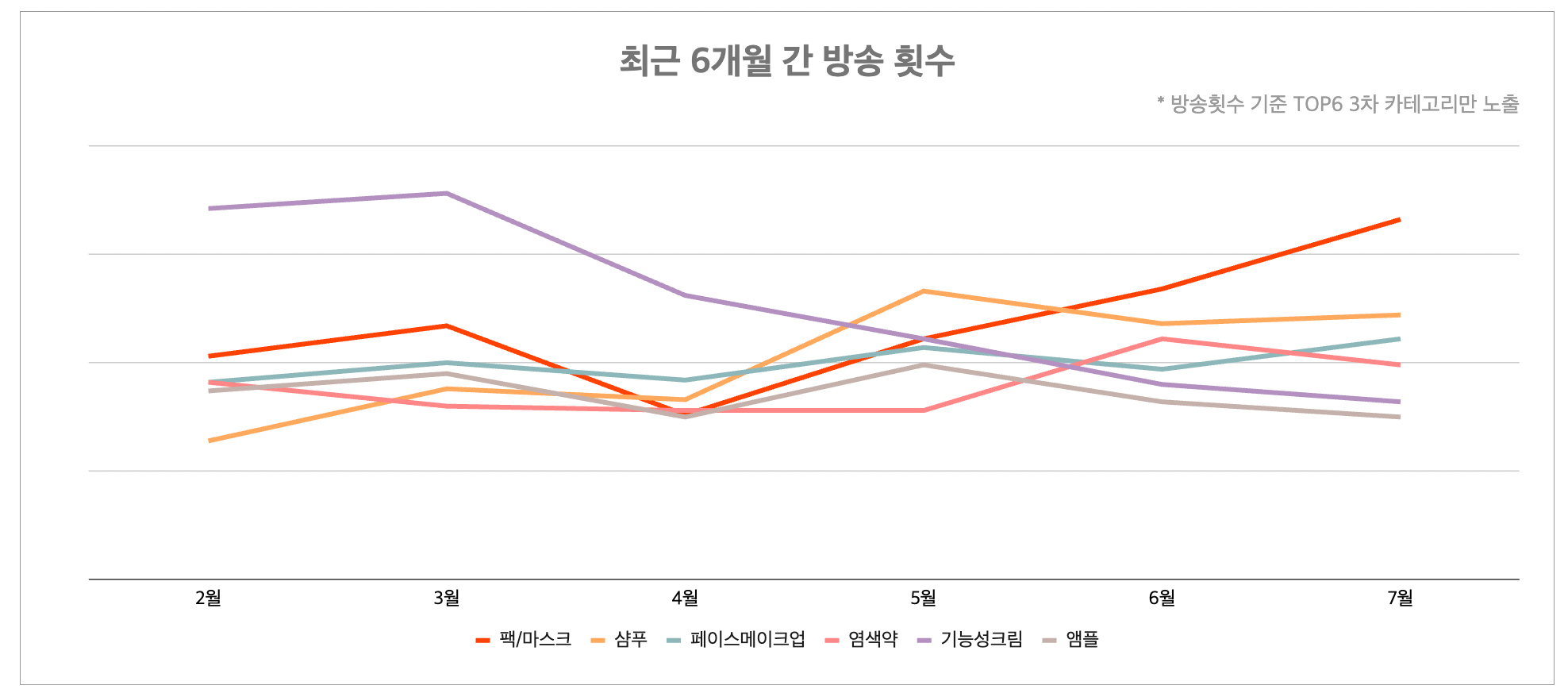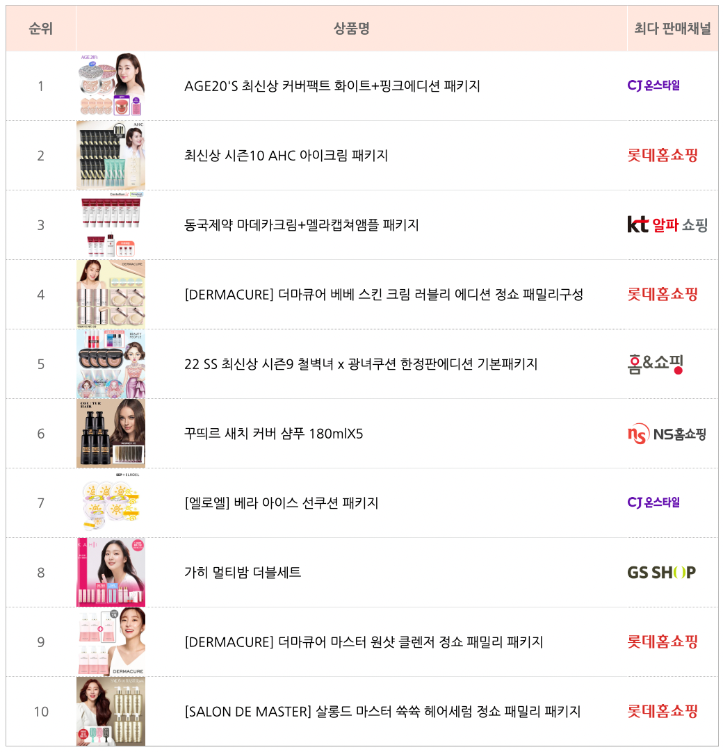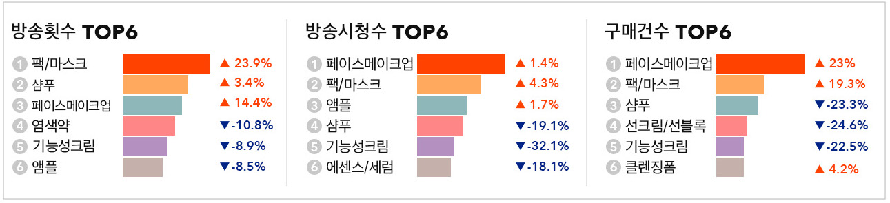 7월에도 마찬가지로 여름휴가, 실외 마스크 의무 착용 해제 등으로 화장에 대한 수요가 증가하면서 페이스 메이크업이 방송 시청수, 구매건수에서 1위를 차지했습니다. 또 마스크로 망가진 피부에 대한 케어에 대한 관심도 높아져 팩/마스크 상품이 방송횟수 23.9%(+) 증가해 1위를 기록했고, 방송시청수는 4.3%(+), 구매건수는 19.3%(+) 올랐습니다. 앰플도 방송횟수에서 6위를, 방송 시청수에서는 1.7% 상승해 3위를 차지했습니다.