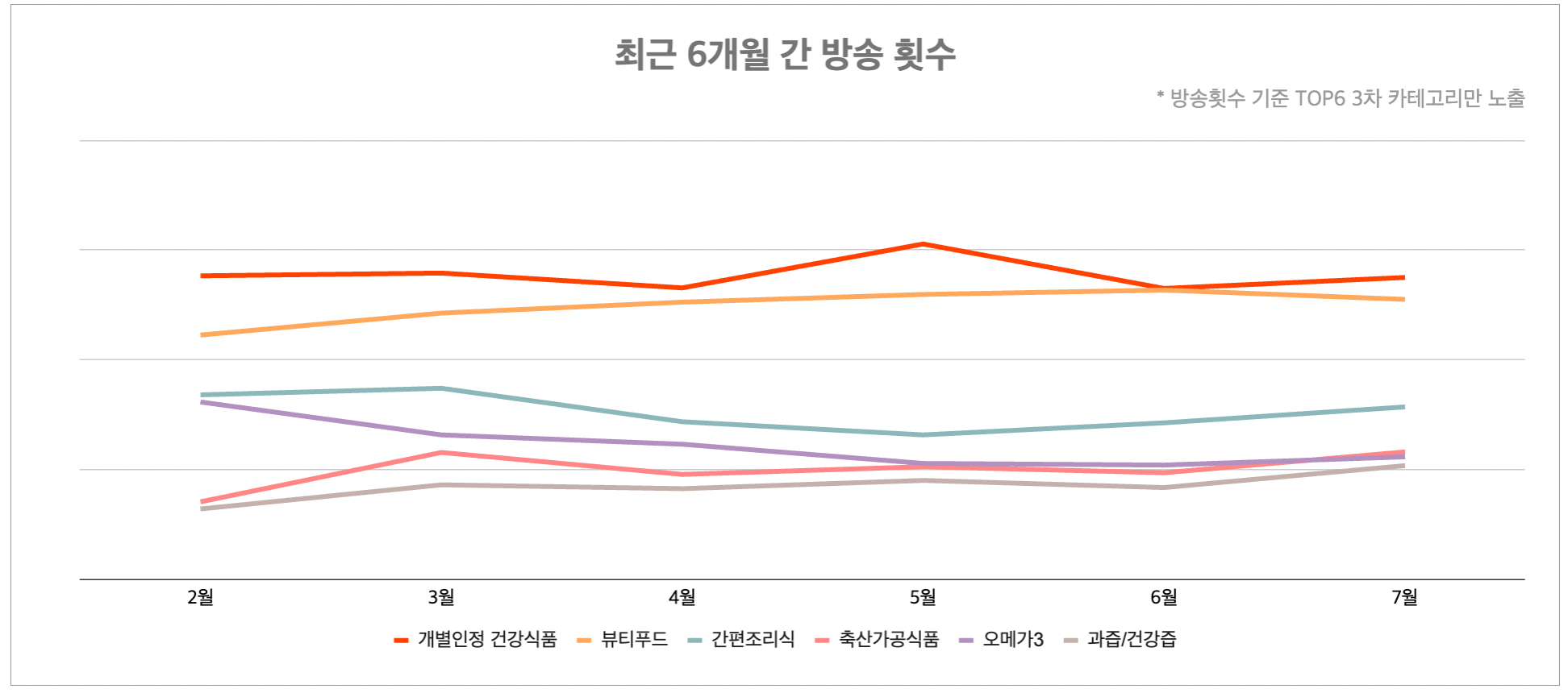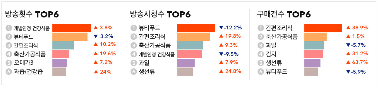 방송횟수 1위를 차지한 개별인정 건강식품은 방송시청수와 구매건수에서는 낮은 순위를 기록했습니다. 반면 코로나19와 여름철 더위로 인해 간편 조리식 상품이 인기를 끌어 방송횟수는 10.2%(+), 방송 시청수는 19.8%(+), 구매건수는 38.9%(+) 증가했습니다. 또 초복, 중복이 지나가면서 몸보신하기 위한 축산가공식품도 방송횟수 19.6%(+), 방송시청수 9.3%(+), 구매건수 1.5%(+) 늘었습니다.
