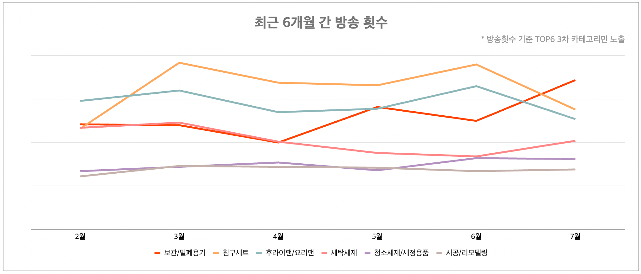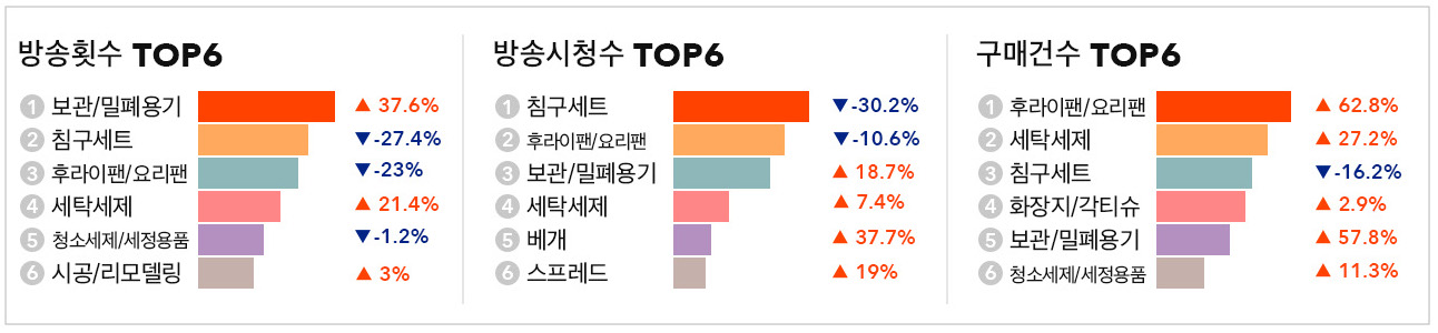 지난 6월 모아차트 TOP100 생활・주방・가구 부문에서 후라이팬/요리팬 상품인 ‘전인화의 쿡셀 더블 블랙큐브 프라이팬 풀세트’가 1위를 차지했습니다. 이러한 후라이팬/요리팬 카테고리가 7월 리포트 구매건수에서도 62.8%(+) 상승해 1위를 기록했습니다. 이와 관련된 냄비세트도 2021년에 7월 대비 8월에 검색량 수치가 197%(+) 상승한 키워드 중 하나인데 앞으로도 주방요리용품이 인기를 끌 것으로 예측됩니다. 또 여름철 잦은 빨래로 인한 세탁세제의 수요도 늘어 방송횟수는 21.4%(+), 방송시청수는 7.4%(+), 구매건수는 27.2%(+) 상승했습니다.