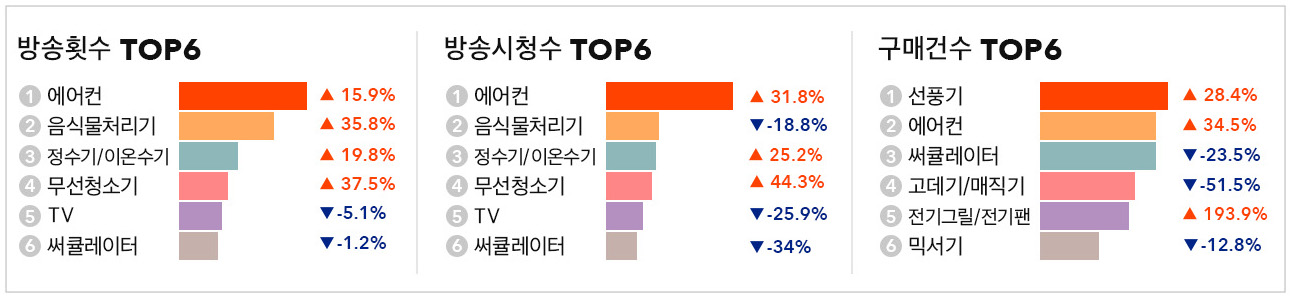 여름철 더 빨리 부패되는 음식물을 처리하고자 하는 니즈를 충족하기 위해 음식물 처리기가 방송횟수 35.8%(+) 상승해 2위를 기록했습니다. 또 땀이 많이 배출되는 만큼 갈증이 늘어나는 요즘 정수기/이온수기도 방송횟수 19.8%(+), 방송시청수 25.2%(+) 올랐습니다. 반면 방송횟수와 방송시청수 순위에는 없었지만 전기그릴/전기팬 구매건수가 193.9%(+) 증가했습니다. 여름휴가로 물놀이 등을 즐기는 사람들이 늘어나면서 이동하기 편하면서도 연기가 많이 나지 않는 전기그릴의 인기가 늘어난 것이 원인으로 예측됩니다.