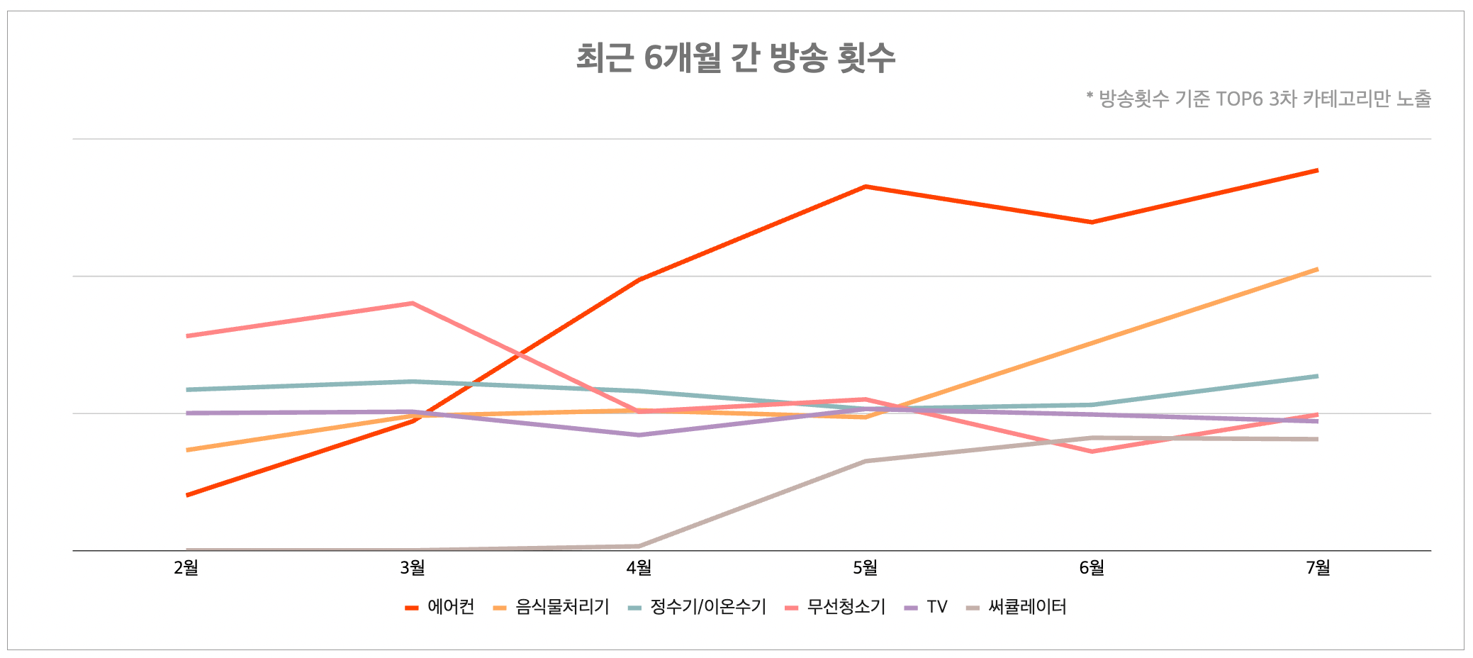이번 7월 가전・디지털 카테고리에서도 에어컨, 써큘레이터, 제습기 등 여름철 인기 있는 가전 상품들이 다수 순위에 올랐습니다. 에어컨의 경우 지난달 대비 방송횟수는 15.9%(+), 방송시청수는 31.8%(+), 구매건수는 34.5%(+) 늘어 1~2위를 차지했습니다.