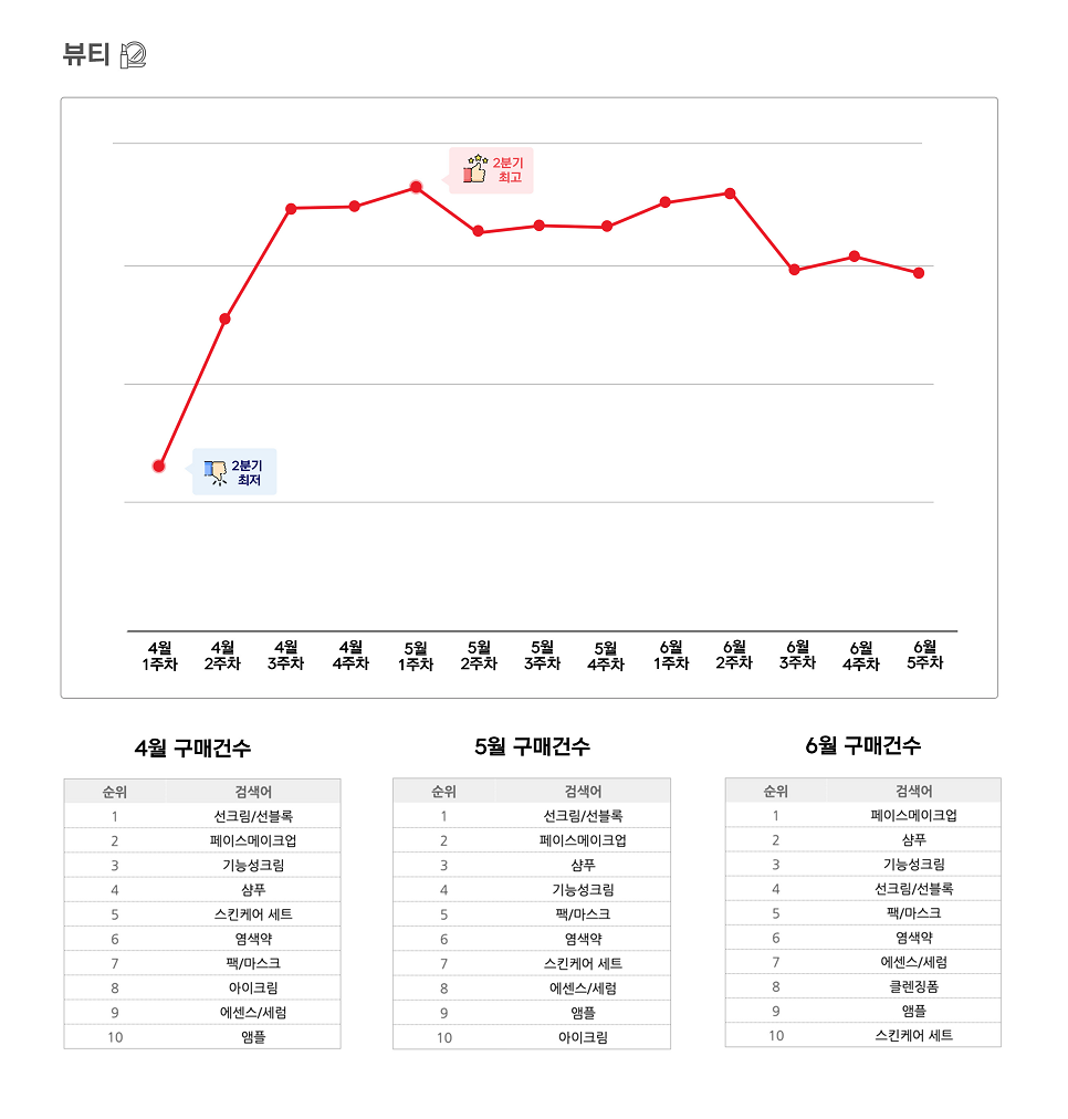 뷰티 카테고리의 경우 4월 1주차에 최저 판매량을 기록했지만 2주차부터는 점차 상승해 높은 구매건수를 유지하고 있습니다. 실내 활동에 집중되었던 지난 2년과는 달리 풀 파티, 워터파크, 해수욕장, 캠핑장 등 야외활동이 증가하면서 여름 휴양지 패션에 어울리는 뷰티 아이템, 특히 무더위에도 무너지지 않는 뷰티 아이템들에 대한 관심이 높아졌습니다. (관련 자료 : 찜통더위 완벽하게 즐기기 위한 뷰티 아이템은? ) 이로 인해 선크림/선블럭, 페이스 메이크업 상품이 2분기 내내 높은 순위를 차지했습니다. 한편 집에서도 편하게 새치 관리를 할 수 있는 샴푸형 염모제가 여전히 인기를 얻어 6월에는 2위까지 올랐습니다.