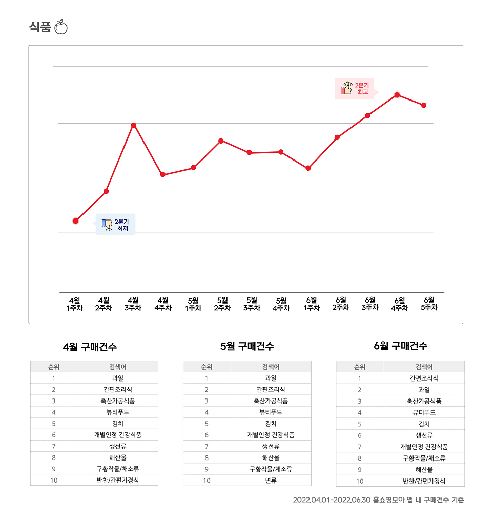 식품 카테고리에서는 4월 1주차가 최저 판매량을 보였지만 서서히 판매량이 늘어나 6월 4주차에 최고 판매량을 기록했습니다. 여름이 제철인 망고, 오렌지류, 참외 등 과일의 구매량이 높았습니다. 또 여름철 몸보신을 하기 위해 갈비탕, 삼계탕과 같은 종류의 간편조리식과 축산가공식품의 수요가 더욱 늘어났습니다. 1분기와 비교했을 때 김치도 점차 판매량도 늘고 있는데 김장김치가 떨어지는 시기일 뿐 아니라 채소류 가격 폭등으로 인해 김치를 사서먹는 소비자들도 증가한 것이 원인 중 하나입니다. 이러한 영향으로 티몬에서만 포장김치 매출은 5월에만 64% 늘어난 데 이어 6월에는 75%, 7월 들어서는 91% 각각 증가했으며 앞으로도 김치 상품의 수요는 늘어날 것으로 예측됩니다. (관련 자료 : “김치 사 먹는 게 더 싸”…고물가·폭염에 ‘김포족’ 더 늘었다)