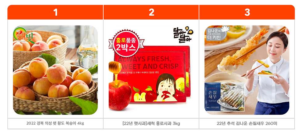 이번 8월 3주차에는 신선식품, 주방용품, 여성의 등 다양한 카테고리가 인기였는데 그중 식품 카테고리의 순위들이 높았습니다. ‘2022 경북 의성 햇 황도 복숭아 4kg’가 지난 8월 2주차에서 9위였지만 이번 8월 3주차에서는 1위를 기록했습니다. 추석이 다가오면서 복숭아, 사과, 새우 등 신선식품류의 판매량이 높았습니다. 또 처서를 앞둔 주차인 만큼 니트와 코트 등 가을/겨울 상품의 판매량이 점차 늘어나고 있습니다.