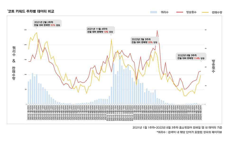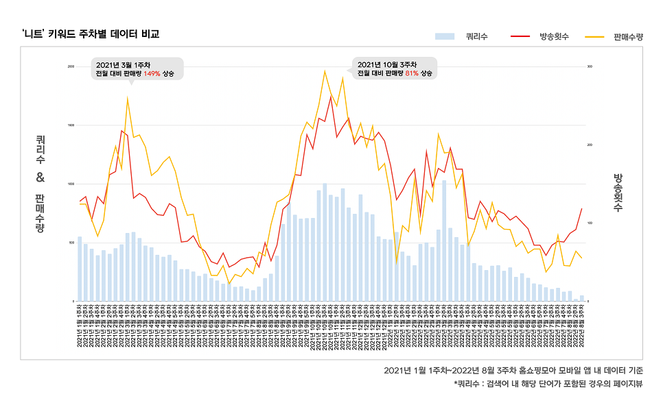 구체적으로 살펴보면 2021년에는 2월 2주차 때 전월대비 방송횟수가 22%(+) 상승했으며 동시에 구매수량은 30%(+) 올랐습니다. 그 이후 수치가 줄어들었다가 가을이 시작되는 8월 말부터 서서히 높아져 11월 4주차때 판매량이 전월대비 13%(+), 방송횟수는 19%(+), 쿼리수는 15%(+) 증가했습니다. 2022년 들어서는 3월 3주차때 전월 대비 방송횟수 25%(+), 구매수량 25%(+) 증가한 후 수치가 떨어졌으나 7월부터 다시 수치가 오르는 모습을 보이고 있습니다. 2021년으로 2022년 수치를 예측했을 때 7월부터 서서히 올라 3월 초까지 데이터가 유지될 것으로 기대됩니다.