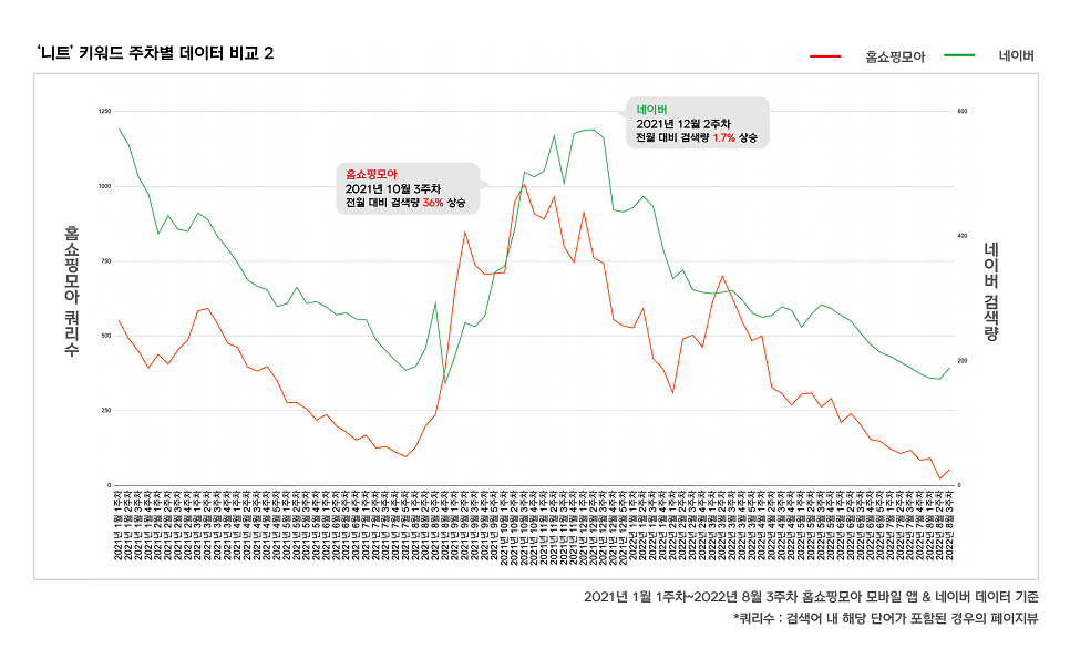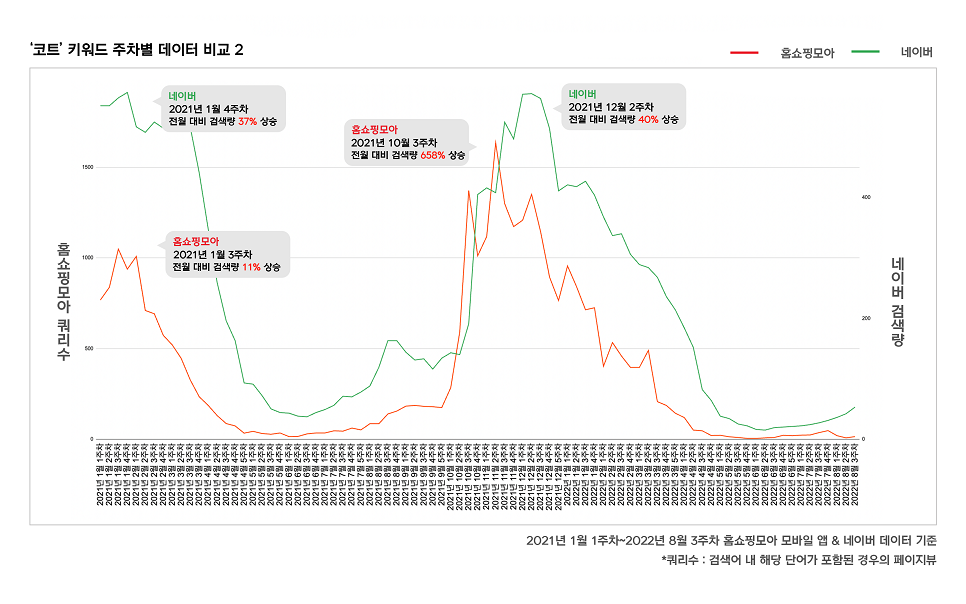 홈쇼핑 외에 네이버에서의 수치는 어떻게 변화했을까요? 홈쇼핑모아 앱 내 쿼리수와 네이버 내 검색량이 비슷한 그래프 모양을 그리고 있습니다. 2021년 홈쇼핑모아 앱 내 쿼리수는 1월 3주차 때 전월 대비 11%(+) 올랐으며 네이버 검색어는 전월 대비 37%(+) 상승했습니다. 그 이후 검색량이 떨어지다가 홈쇼핑모아 앱 내 쿼리수는 2021년 10월 3주차 전월 대비 검색량이 658%(+) 증가했습니다. 반면 네이버 검색량은 2021년 12월 2주차 전월 대비 40% 상승했습니다. 이러한 수치를 보았을 때 2022년에도 10~1월에 가장 검색량이 높을 것으로 예측됩니다.