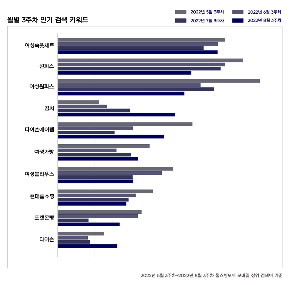 2022년 8월 3주차에는 인기 검색어 1, 2위로 ‘여성 속옷 세트’와 ‘원피스’가 각각 차지했습니다. 김치 키워드는 지난 주차에 이어 이번 8월 3주차에도 4위를 차지했으며 5월 3주차 대비 188%(+), 6월 3주차 대비 138%(+), 7월 3주차 대비 63%(+) 수치가 올랐습니다. 한편 글로벌 테크놀로지 가전 브랜드 다이슨이 7월에 신상품인 에어랩 멀티 스타일러을 출시하면서 수치가 급상승했습니다. 6월 3주차 대비 41%(+), 7월 3주차 대비 89%(+) 올라 인기를 가속화하고 있습니다. 이러한 니즈에 보답하기 위해 현대홈쇼핑은 8월 21일까지 신제품 '에어랩 멀티 스타일러'와 다양한 상품들을 '다이슨 위크'를 통해 진행하기도 했습니다. (관련 자료 : 현대홈쇼핑, 다이슨 위크 진행…프리미엄 수요 공략)
