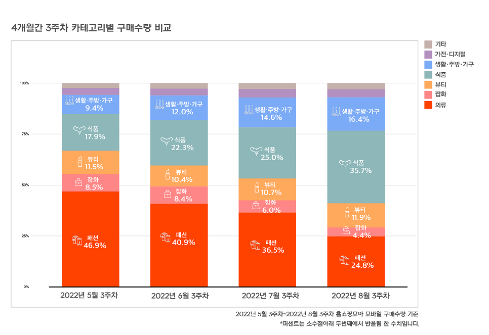 의류 카테고리는 2022년 5월 3주차 가장 점유율이 높았지만 서서히 감소해 8월 3주차에 수치가 급격히 떨어졌습니다. 반면 식품 카테고리는 꾸준히 구매 수량이 증가해 8월 3주차 때 가장 많아져 패션 부문을 앞섰습니다. 간편조리식과 축산가공식품, 김치의 판매량이 높았는데 추석이 다가오면서 수치가 더욱 상승한 것으로 예측합니다. 식품 카테고리뿐 아니라 뷰티업계에서도 추석 프로모션을 진행해 소비자들에게 혜택을 제공하고 있습니다. CJ올리브영은 추석 특집 라이브커머스 ‘올영라이브’를 열고 다양한 선물 상품을 특가에 선보일 계획을 세우면서 마케팅을 가속화중입니다. (관련 자료 : 뷰티업계, ‘추석마케팅’에 총력...다양한 프로모션으로 눈길) 생활・주방・가구 부문도 6월 3주차부터 서서히 점유율이 늘어 8월 3주차에는 5월 3주차 대비 7%(+), 6월 3주차 대비 4.4%(+), 7월 3주차 대비 1.8%(+) 늘었습니다.