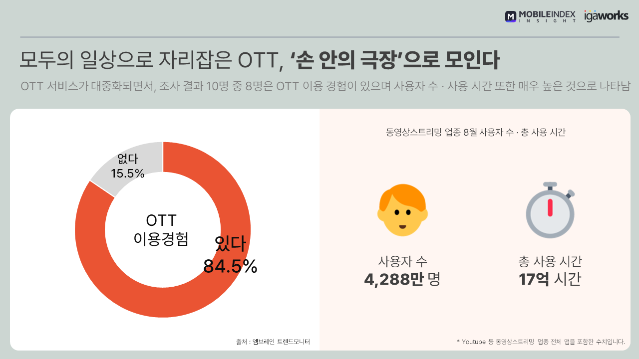 조사에 따르면 10명 중 8명은 OTT 이용 경험이 있는 것으로 나타났는데요, 또한 지난 8월 동영상스트리밍 업종 사용자 수는 무려 4,288만 명, 총 사용 시간은 17억 시간으로 OTT서비스는 더 이상 우리의 일상에서 뗄레야 뗄 수 없는 서비스가 되었습니다.