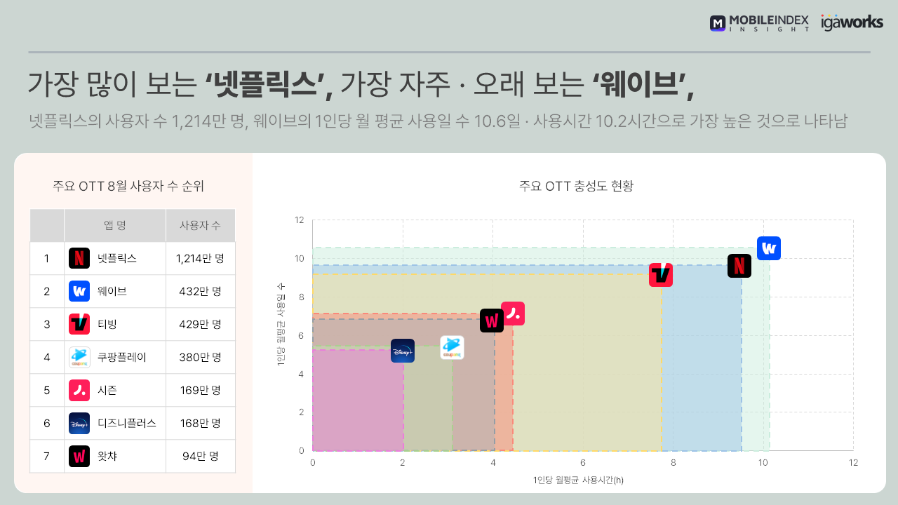 주요 OTT 앱의 8월 사용량을 살펴보면 가장 많은 사용자 수를 기록한 앱은 '넷플릭스'였습니다. 1,214만 명이라는 압도적인 수치로 1위를 차지했습니다. 그러나 1인당 월평균 사용시간·사용일 수 를 차지한 앱은 '웨이브'로 나타났습니다.
