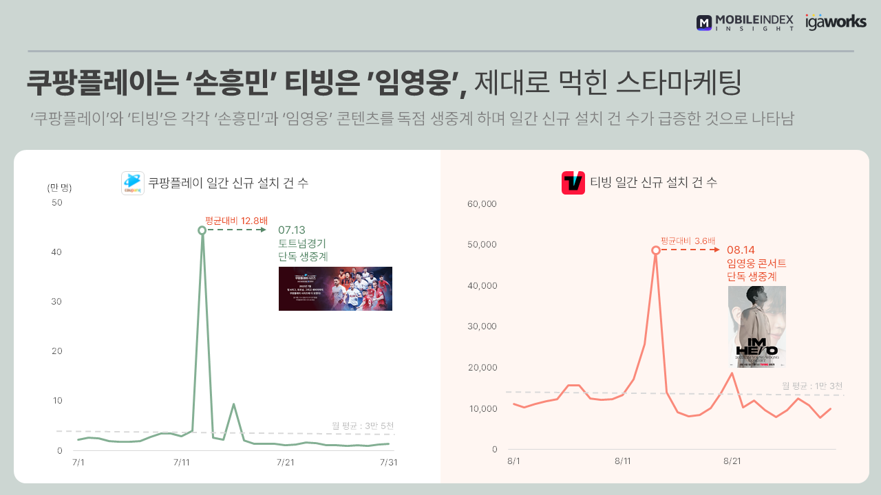 이런 사례는 다른 OTT에서도 쉽게 찾아볼 수 있었는데요, 쿠팡플레이는 손흥민 선수의 토트넘 경기, 티빙은 임영웅 콘서트를 독점 생중계 하면서 신규 설치 건 수가 급증했습니다. 특히 쿠팡플레이가 토트넘 경기를 단독 생중계한 7월 13일, 7월 평균인 3만 5천 건수 대비 무려 12.8배가 상승한 45만 건수를 기록한 것으로 나타났습니다.