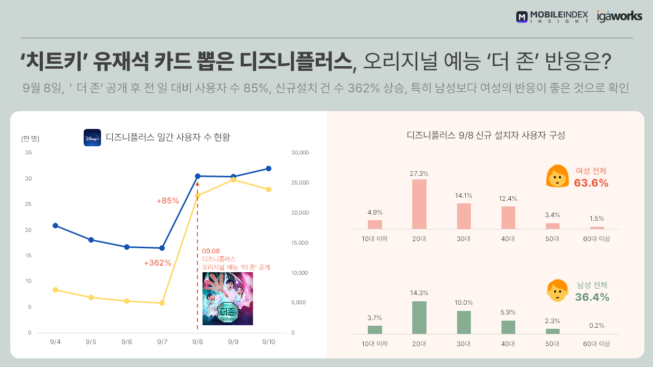 먼저 더 존이 공개된 9월 8일, 디즈니플러스의 일간 사용자수와 신규 설치건수는 크게 상승했습니다. 전일 대비 일간 사용자 수는 85%, 신규 설치 건수는 무려 362% 상승한 것으로 나타났습니다.