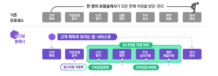 [기존 보험 판매 프로세스와 시그널플래너 프로세스 비교]