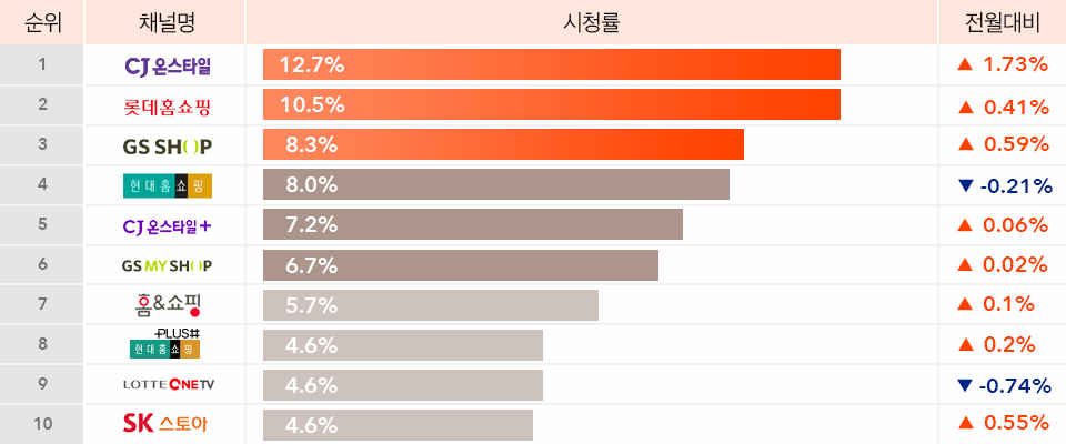 9월 18개 홈쇼핑 & T커머스 채널 중 CJ온스타일이 전월대비 1.8% 올라 가장 높은 시청률을 기록했습니다. 이어서 롯데홈쇼핑이 2위를 차지했으며 3위로는 GS홈쇼핑이 0.6% 올라 한계단 상승했습니다. 반면 8월에는 추석의 영향으로 공영쇼핑이 9위에 올랐지만 이번에는 현대홈쇼핑플러스샵이 8위, 롯데OneTV가 9위를 차지했습니다. 또 헬렌카렌, 인디코드 등 패션 PB 브랜드의 인기로 SK스토아가 10위에 올랐습니다.