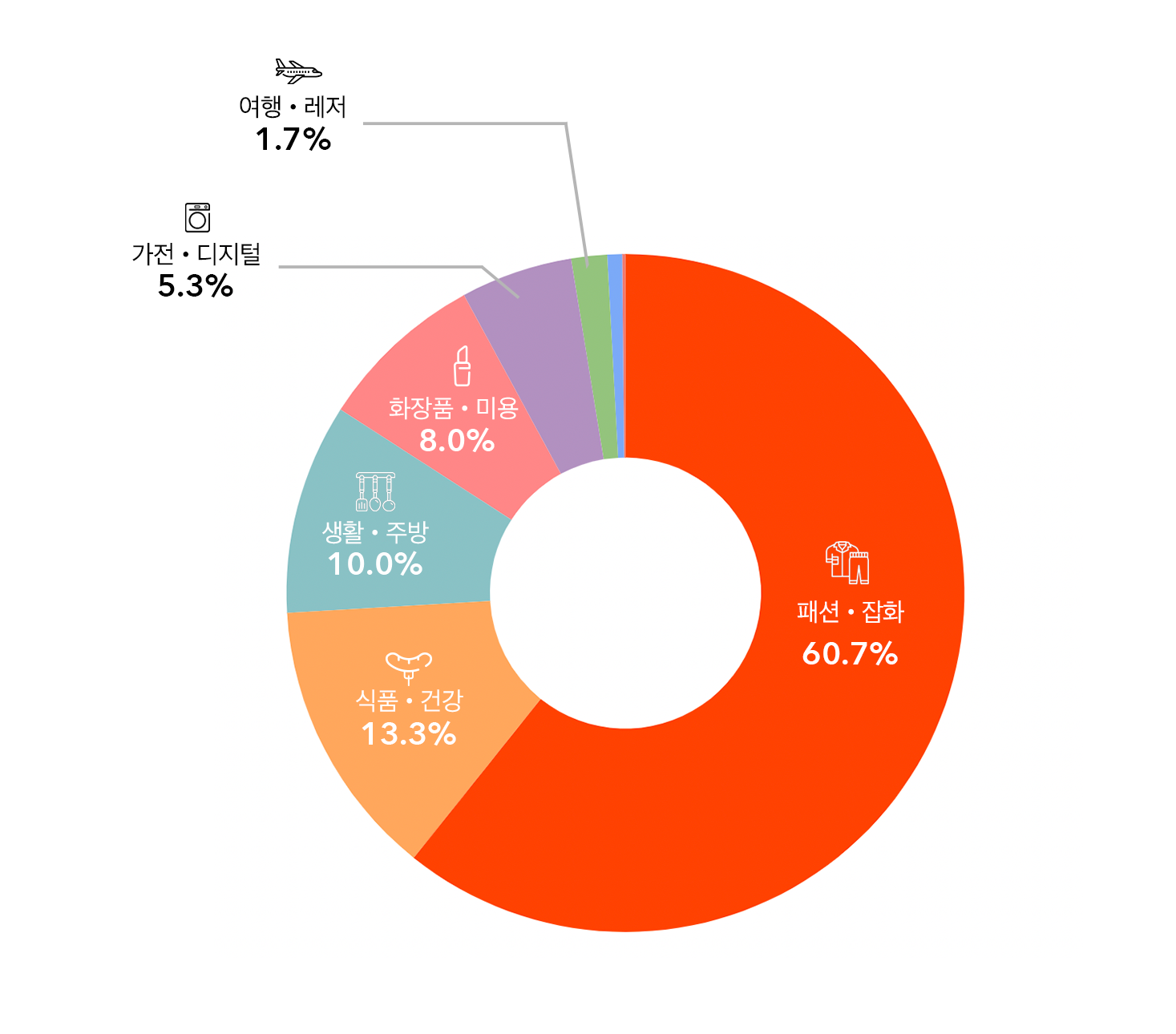 9월 홈쇼핑모아 사용자가 가장 많이 시청한 제품군은 ‘패션·잡화’로 총 시청수 가운데 60.7%를 차지했습니다. 이는 지난달 보다 9.5% 상승한 수치인데요. 날씨가 서늘해지면서 여성 속옷과 원피스의 소비가 줄어들고 재킷, 니트류의 소비가 증가했습니다. 다른 카테고리 수치는 어떻게 변화했을까요?
