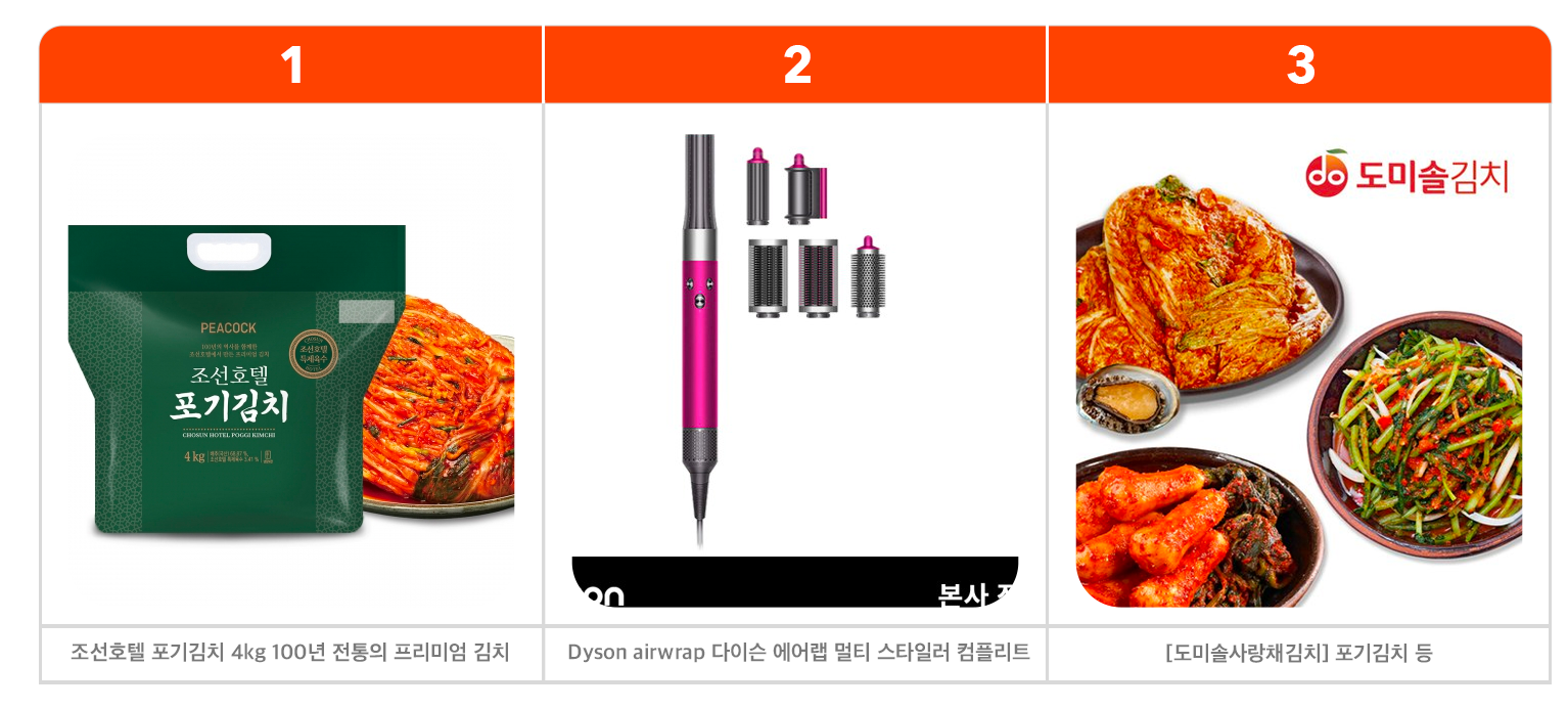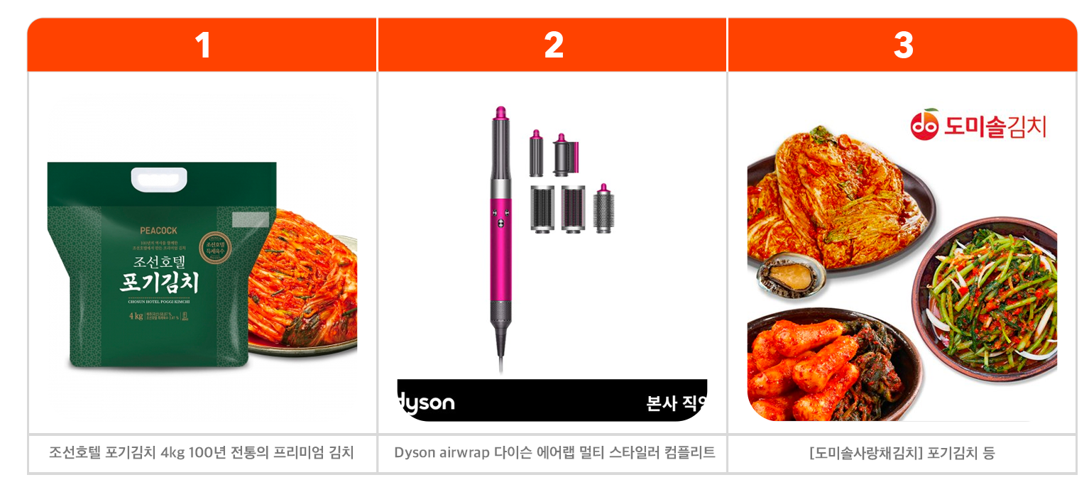 또 무가 제철인 만큼 포기김치뿐만 아니라 총각김치를 세트로 판매하는 김치 상품의 판매량이 늘었습니다. 김수미엄마생각 김치와 도미솔 김치가 김치 패키지 상품으로 나란히 3, 4위에 올랐습니다.