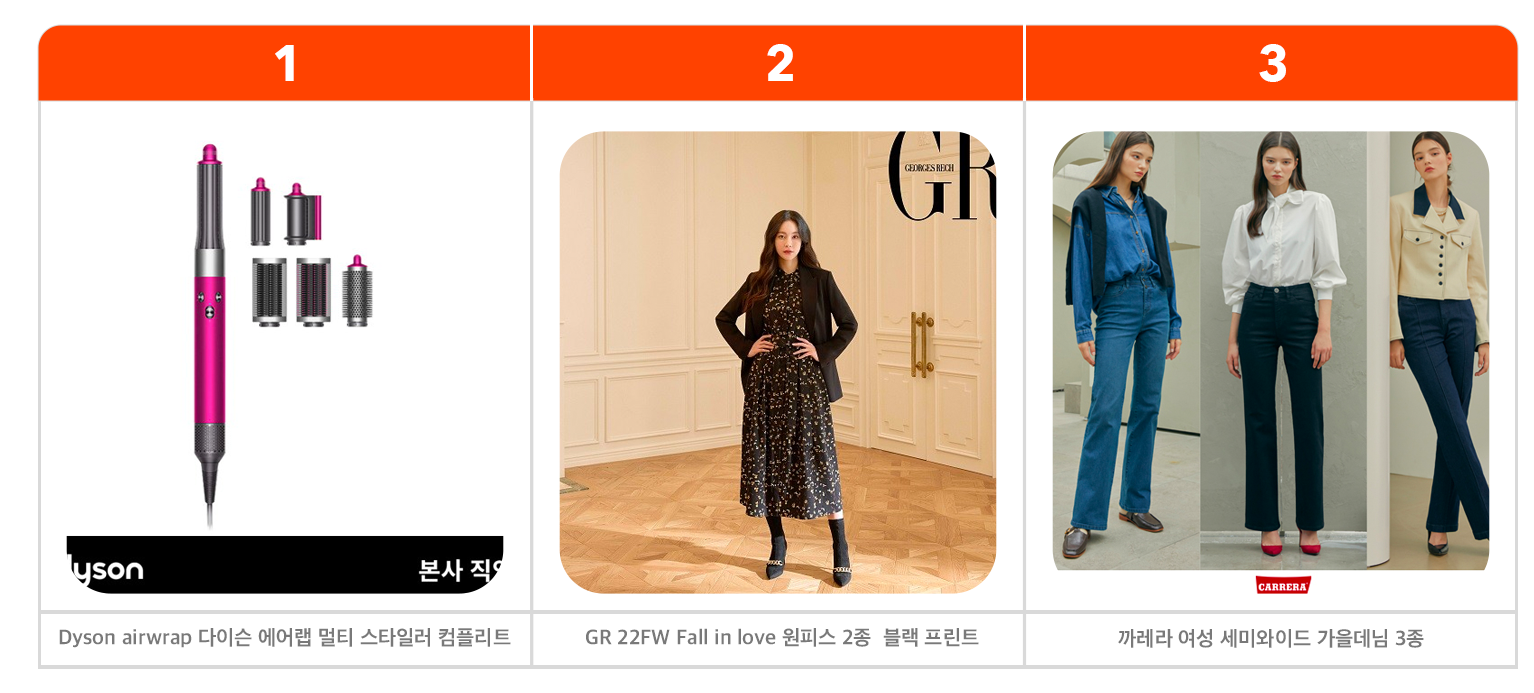 상품조회 1위는 8월에 이어 9월에도 ‘다이슨 에어랩 멀티 스타일러 컴플리트’가 차지했습니다. 상품조회 카테고리는 의류 상품이 인기를 끌었는데 가을 원피스, 가을 데님, 블라우스 등 가을 상품의 조회 수가 높았습니다.
